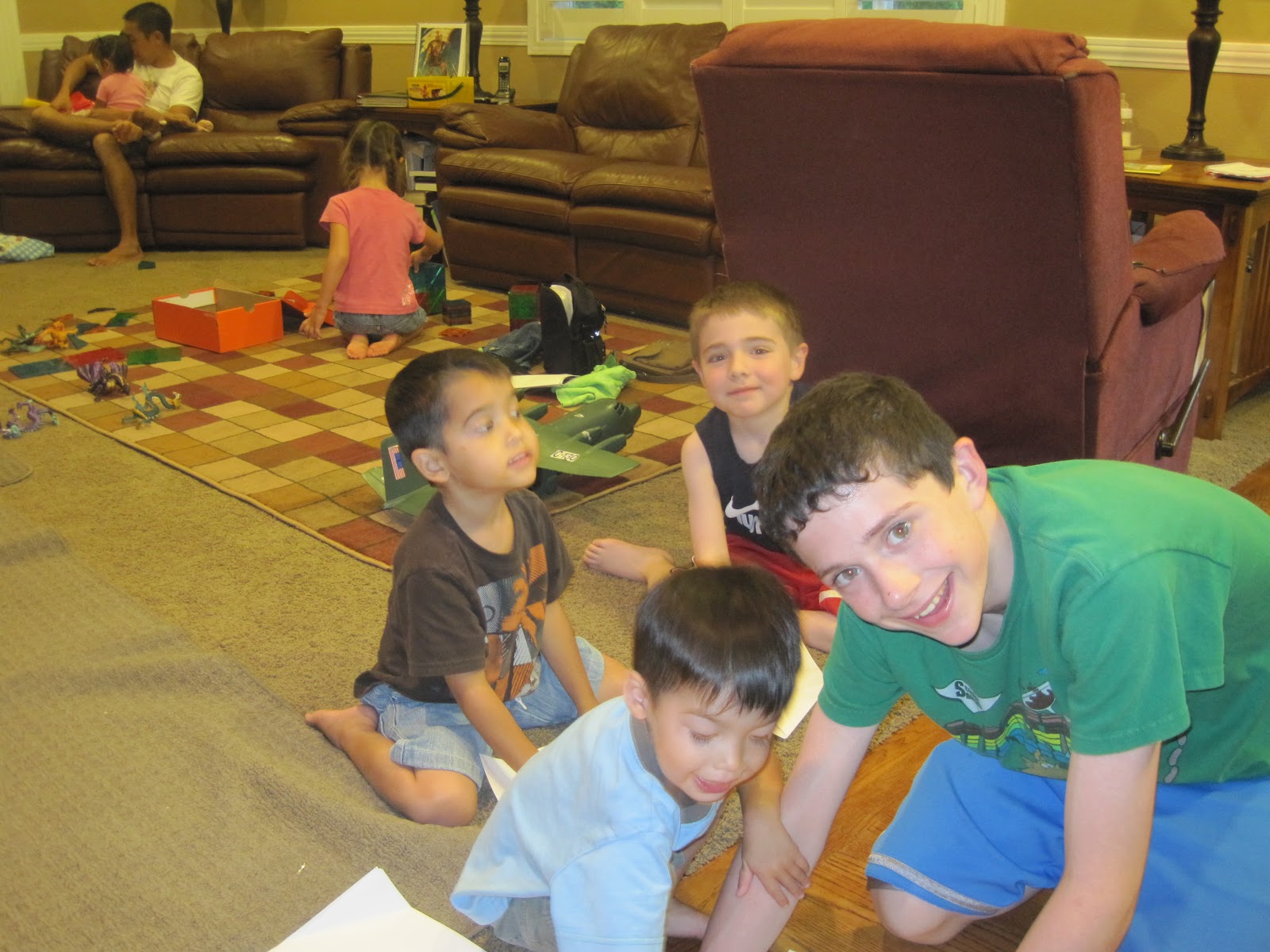 Time for Family Home Evening! It was cute, all the Jones kids had a Kim kid in their lap or by their side.